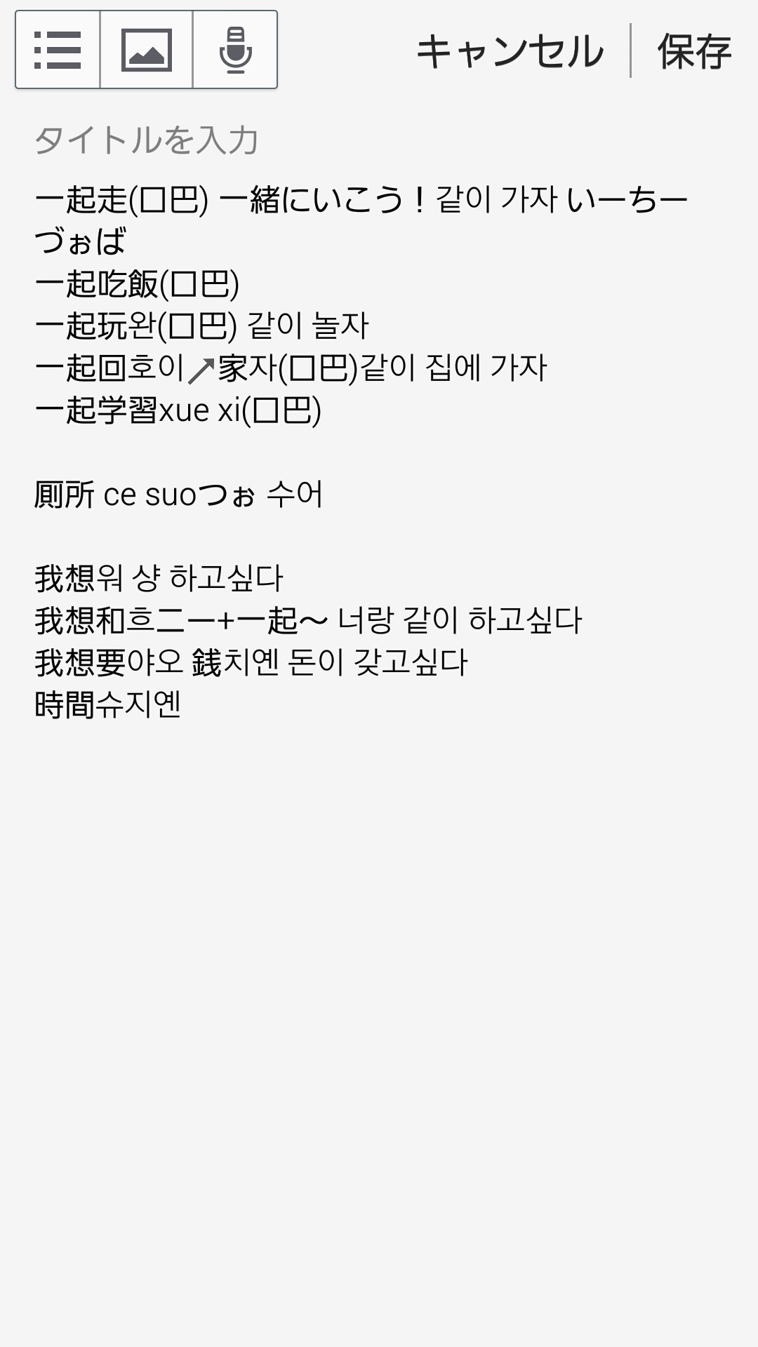 中国語講座 大学院生生活 2015年04月08日 加納ゼミは5人中3人が中国人。研究生の2人も中国人。しかも、もう一人の日本人の方はお仕事で休学…そんなわけで、私の周りは時々、中国語コミュニティーに変身することがあります!この中で私だけ中国語がわからない?!そんなの嫌だ!私もみんなが話してるの聞きたい!ってわけで、最近ゼミ仲間に中国語を教えてもらっています。第一回は「一緒に~しよう!」の文形一起~吧講師はハンちゃん。霧雨降ってて、面倒くさくて傘を差さなかった私にハンちゃんが傘を差し出しながら「一緒にいこう!」と言ってくれたのがきっかけでした(*´ω`*)第二回は「~したい!~ほしい!」の文形我想(要)~講師はリンリン。リンリンは私が中国語にチャレンジしてるの見てすごく嬉しそうにしてくれる♪「今日はどの文形する?」って聞いてきてくれたので、欲深い私はこの文形をチョイスしたのでした(ワハハウォーシャン フーニー シュエシィ!リンリン、君ともっと勉強したいぞ♪(~を、の文形はまだ未導入(笑))私は「発音から順序立てて学習する」というのがどうも性に合わなくて、人と会話しながら覚えていくのが好きなタイプ。気がついた文型について、単語を置き換えるドリル練習が相性良いみたいです。(順序バラバラなオーディオリンガルメソッドですね(笑))しかも、私が同じ文型でしつこく何度話しかけても、みんなが反応してくれるから嬉しくて(*´ω`*)通じる楽しさを肌で感じる。これは外国語学習の一番の醍醐味ですな。最後に、私のメモ帳をご紹介(*´ω`*)発音は韓国語で書いた方がしっくりくることがあるのです♪日本語と韓国語と英語と、その時自分が一番しっくりくる音を当ててます。音声はtranslanguagingしないって加納先生仰ってました。だけど、音声こそ「1つのレパートリー」として私は感じやすいので、ストラテジーとしてこんな風にアレンジしてます。今思えば、これは韓国留学してから出てきたやり方かな。では!